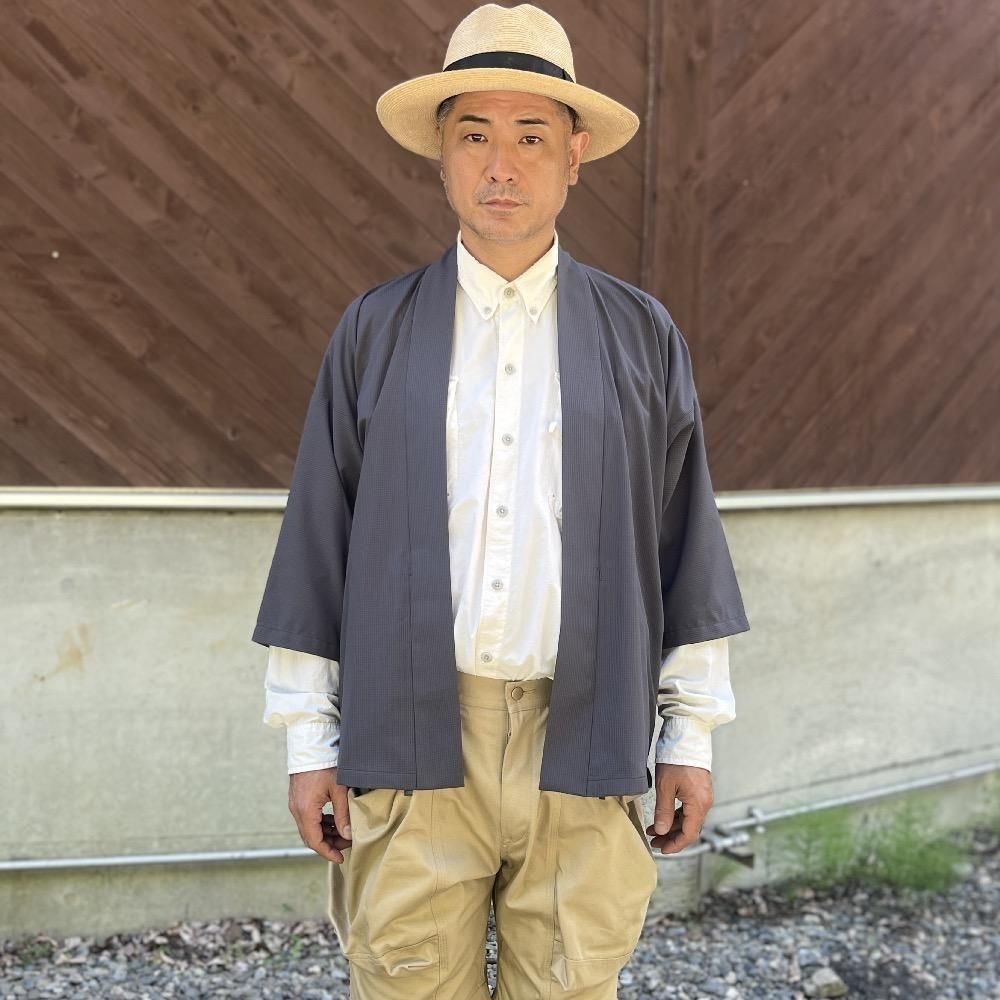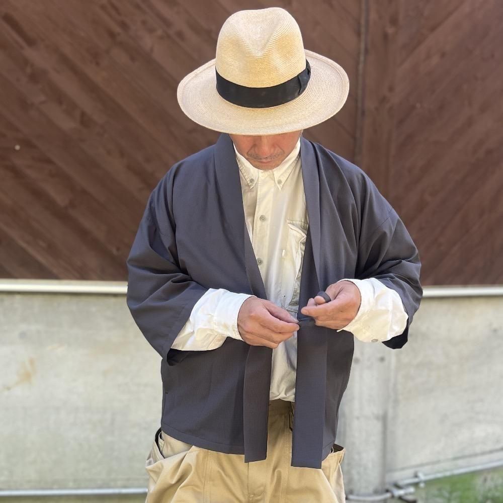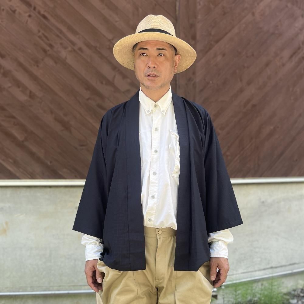 2年ぶりのリリースとなる"和ROBE HANTEN"の岡部氏別注モデル最新作。シルエットもアップデートし、前作より全体を一回り大きく、袖の付け根の形状を太くしたリラックスフィット。"軽さと涼しさ"に特化した今作は、東レの快適高通気織物「Dot Air」のリップストップ素材を採用。マイクロメッシュ構造による抜群の通気性、速乾性、軽量感に加えて、優れたストレッチ性と防シワ性、ウォッシャブル性を備えた、快適に着るための機能が満載。サイドポケット配備、内ポケット配備、フロントの紐は内外両方から出せる2WAY仕様。背中に大きく"刈マーク"がリフレクタープリントで入ります。和ROBEオリジナルロゴ刺繍入り。
